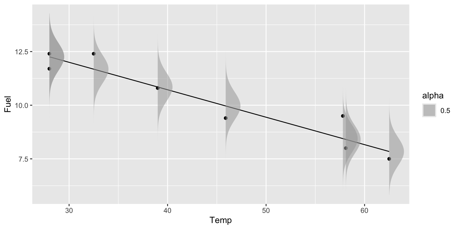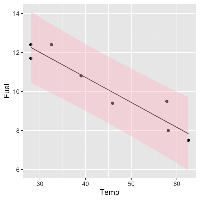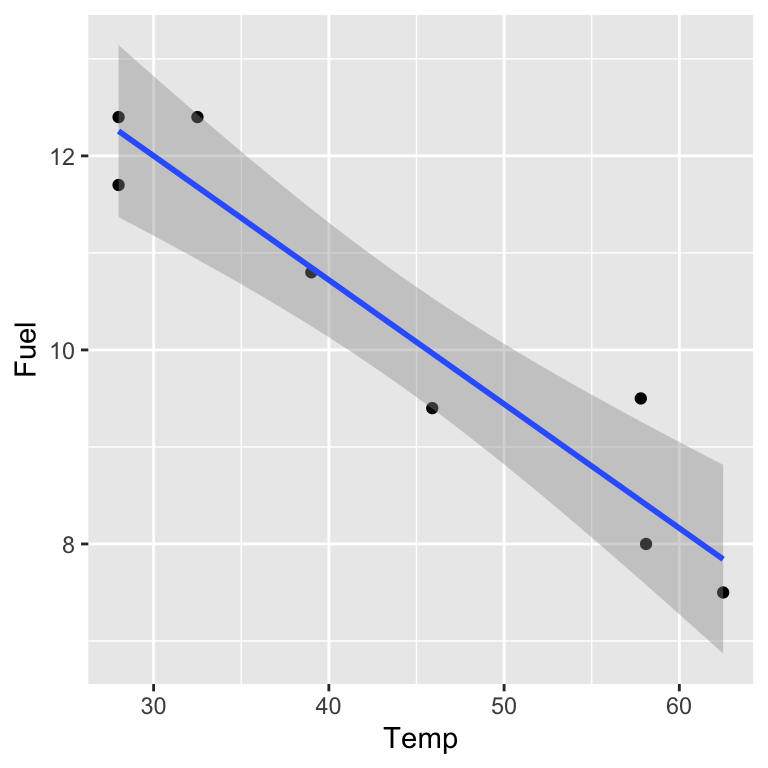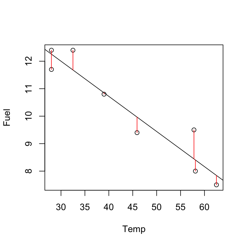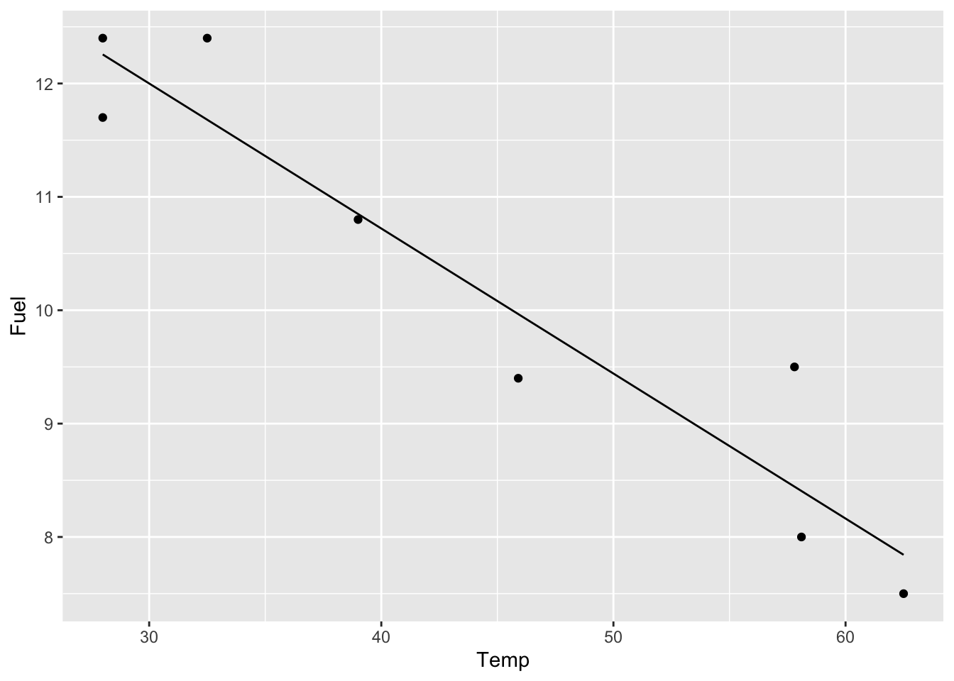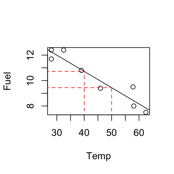 For example, at \(x=30^oF\): \[\hat{y}_i = 15.84 - 0.128 \times 30 = 12.\] 12 units of fuel is the estimated fuel use at \(30^oF\).