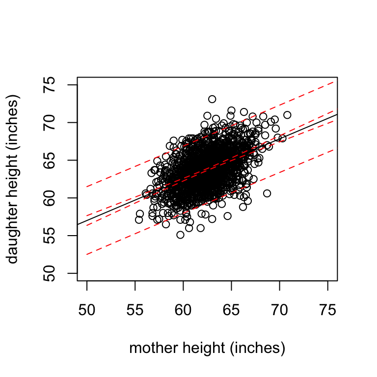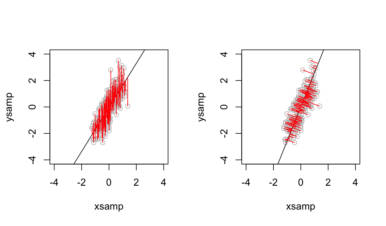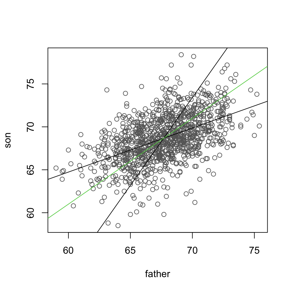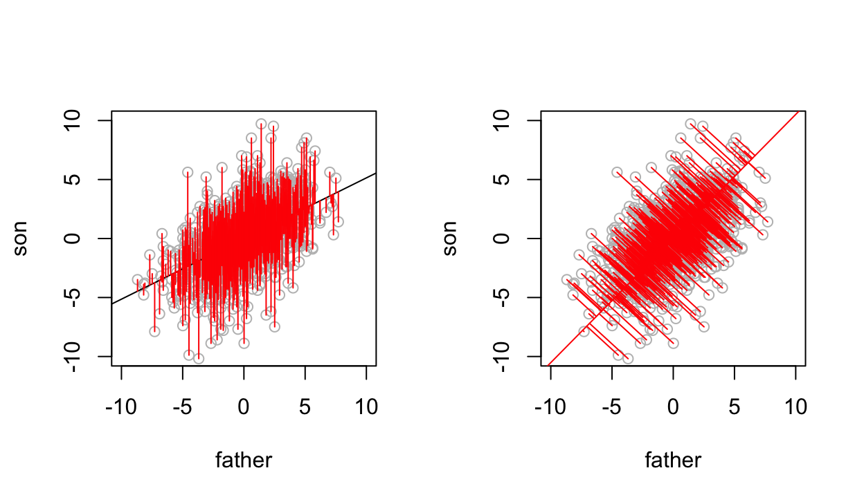 Regressing \(y\) on \(x\), treats \(x\) variable as fixed and only vertical distances are minimized. Howevever, regressing \(x\) on \(y\), i.e. trying to predict the fathers’ heights from their sons’ treats the sons’ heights \(y\) as fixed and the least squares criterion minimizes the horizontal distances.