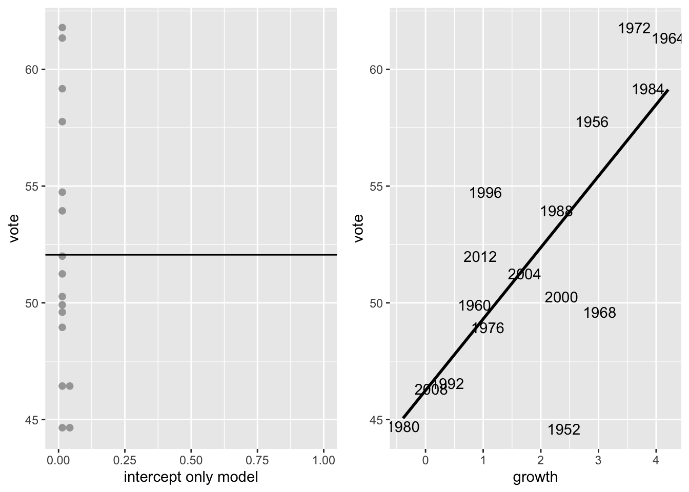 One can also compare \(R^2\) as long as the \(y\) values are on the same scale. Furthermore, \(R^2\) doesn’t follow a distribution, so we can’t compare \(R^2\) in two models and know that one is meaningfully better.