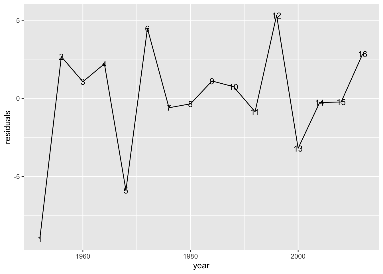 A plot of \(e_i\) vs. \(t_i\) (time of the i\(^{th}\) observation) may be examined for patterns.