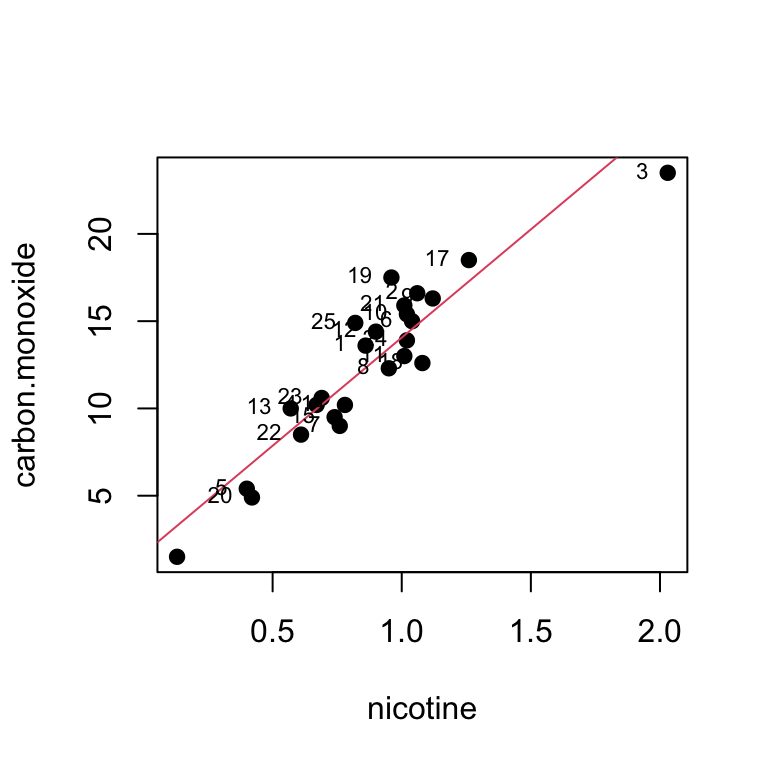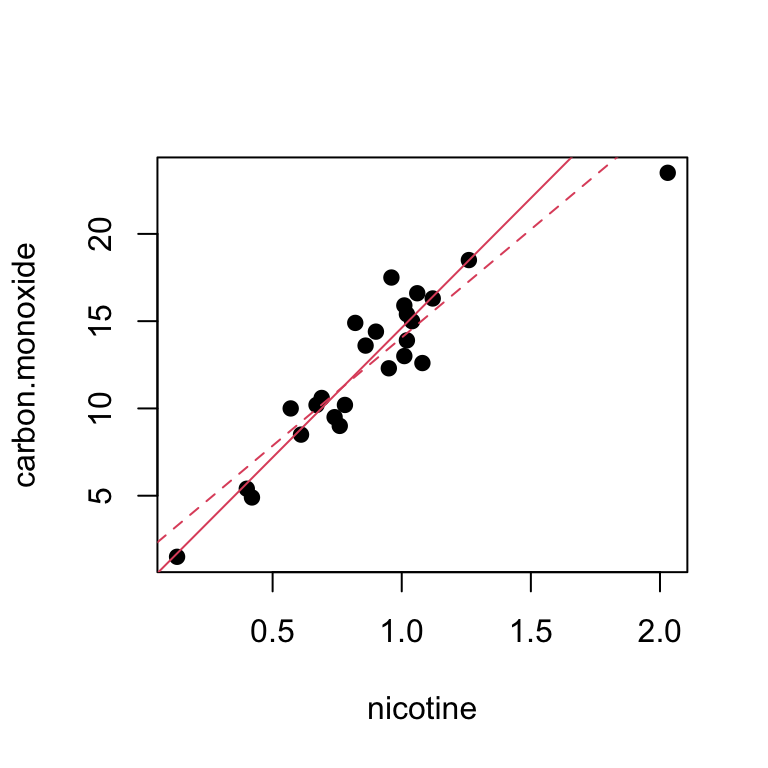 FDA data on cigarettes, response is carbon monoxide, predictor is nicotine. Data from McIntyre (1994).
