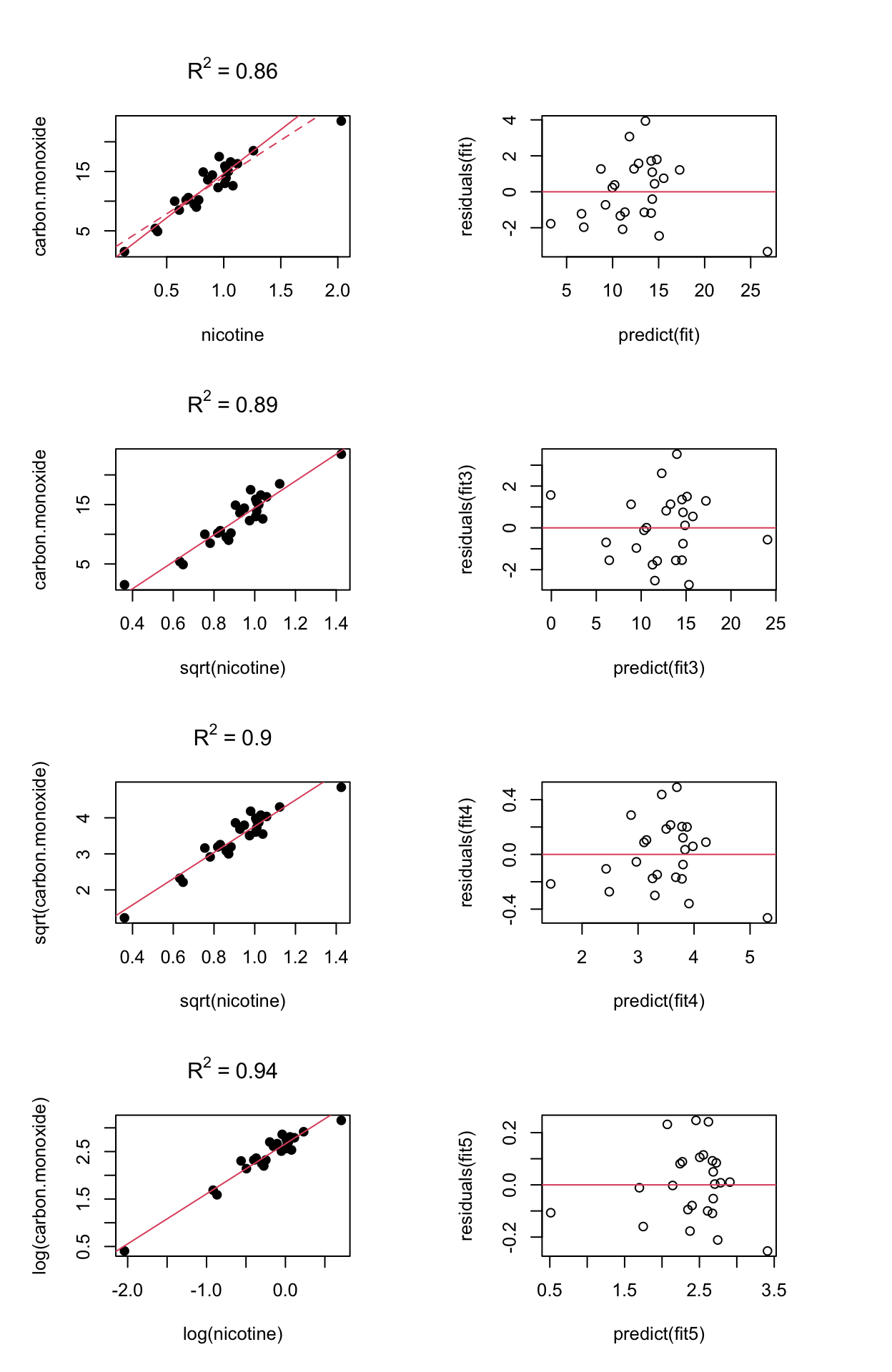 - Row 2: use a square root transformation for the predictor. This diminishes the influence of the outlier. The residual plot hints at a small amount of bias.
