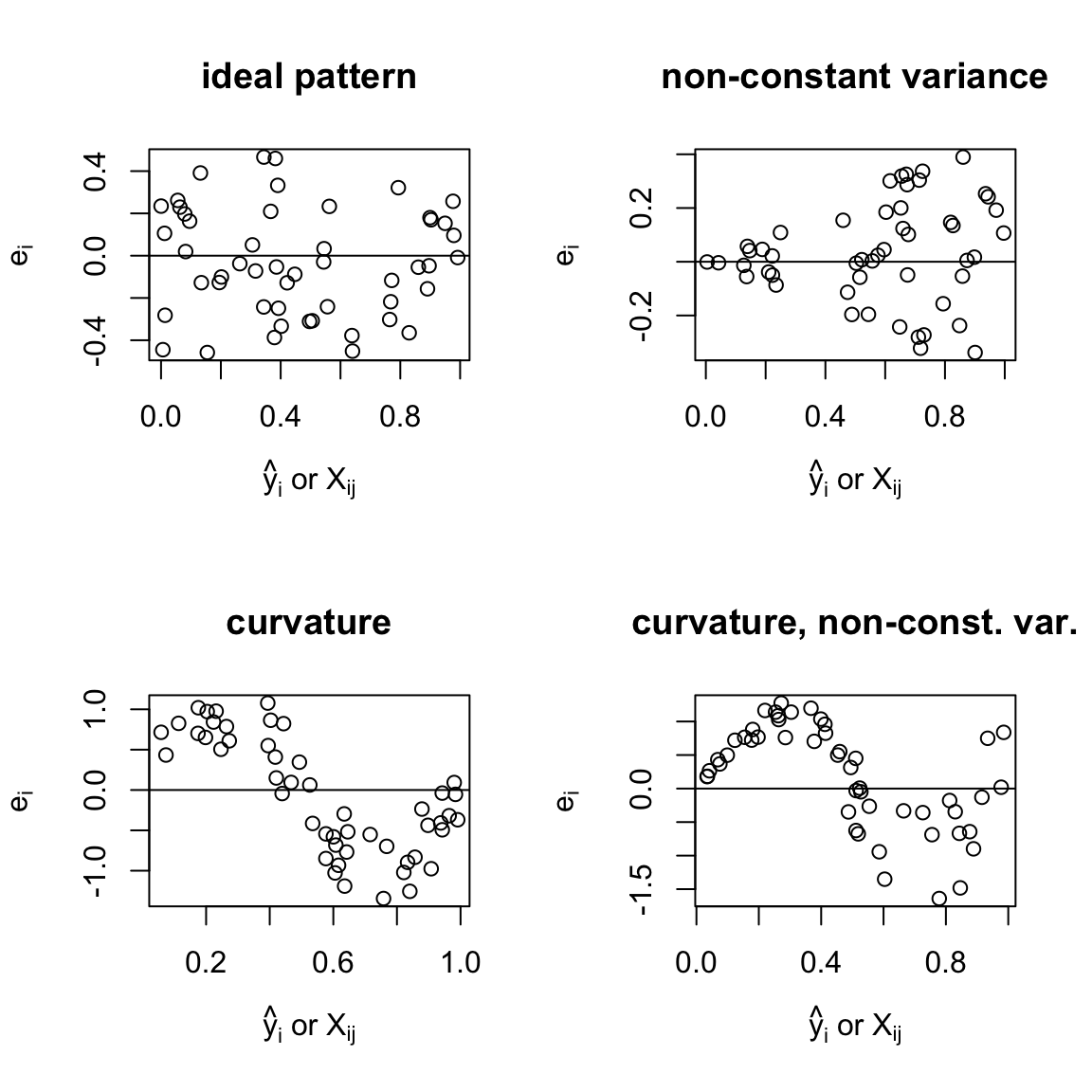 - \(e_i\) vs \(X_{ij}\) (residual vs predictor \(j\)).