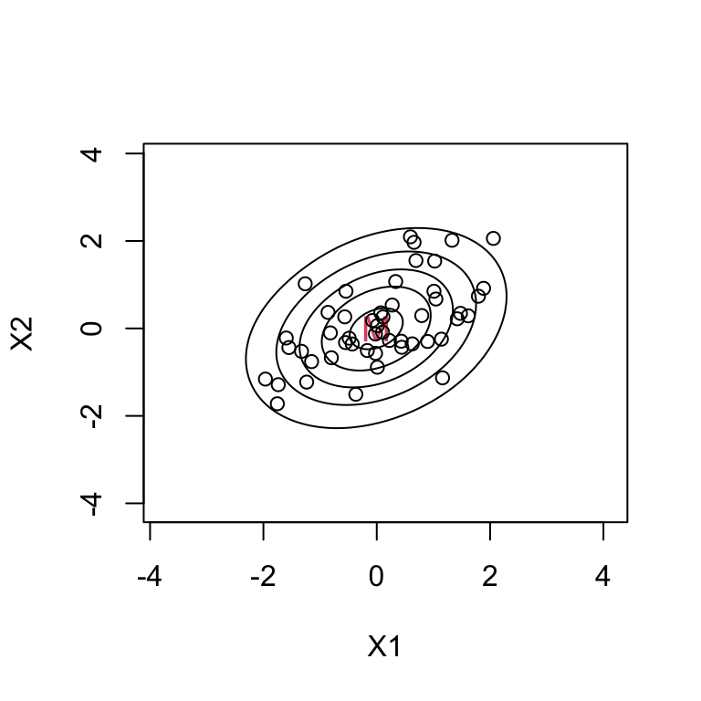 Therefore \(h_{ii}\) measures the `distance’ of case \(i\) from the average case \(\mathbf{M}\).