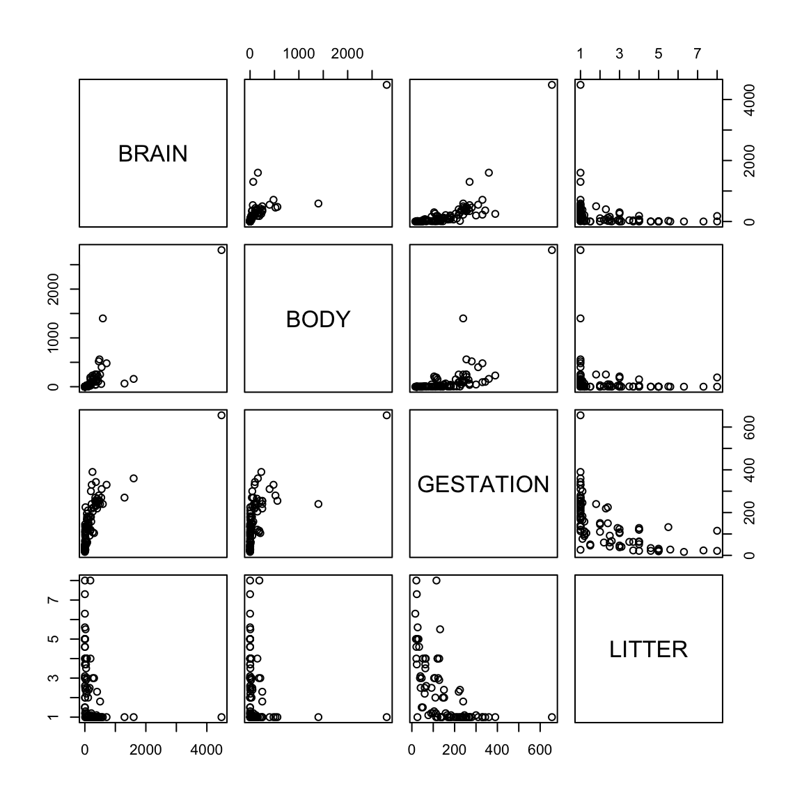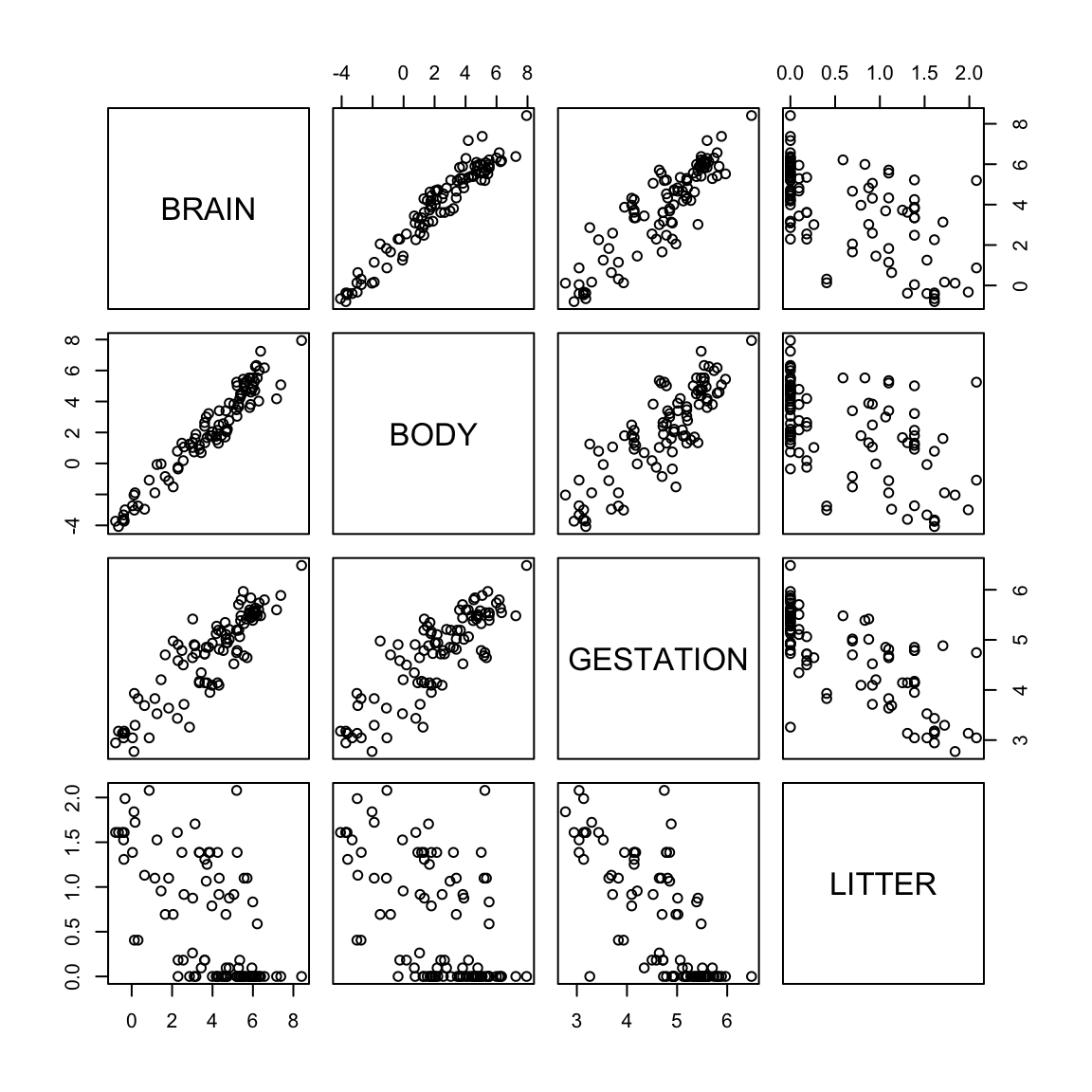 The skeweness is gone. The plot of log(brain) vs log(body) shows a strong linear pattern - not apparent with the untransformed variables. Therefore the log transformation of these two variables seems appropriate. The other variables are also less skewed than before.