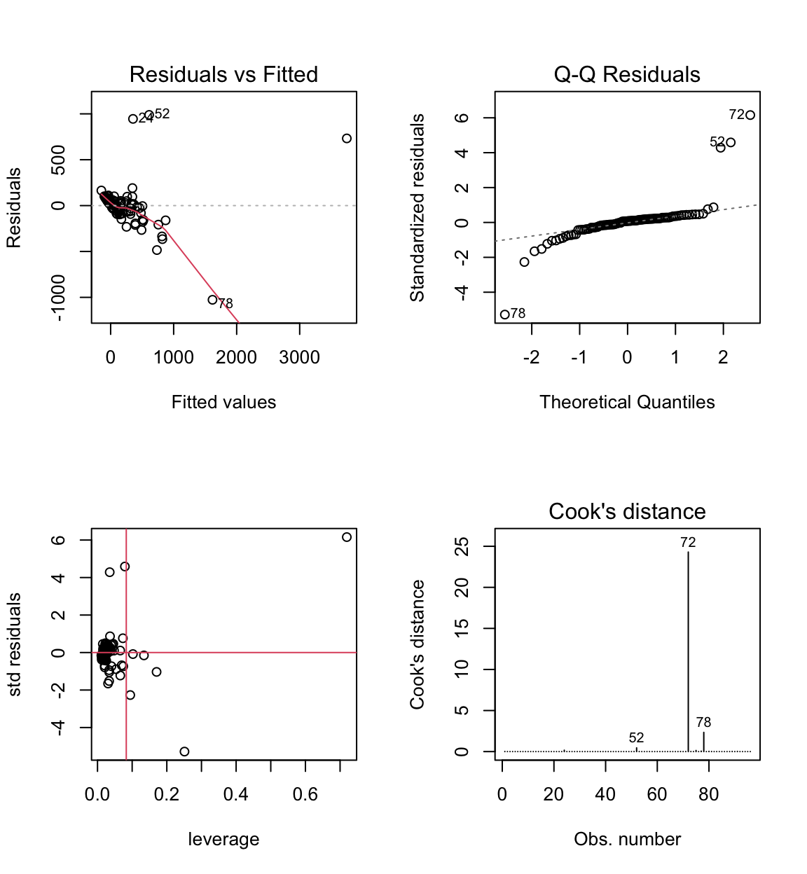 Observations with high leverage need to be inspected carefully as they might have a large influence on the fit.