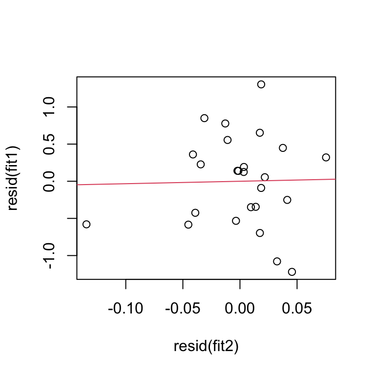 ## lm(formula = resid(fit1) ~ resid(fit2))