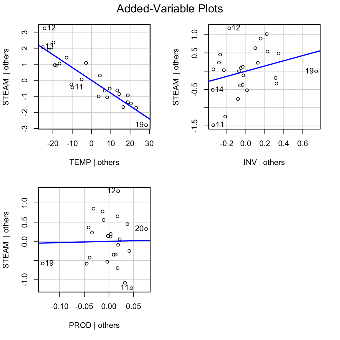 ## lm(formula = STEAM ~ TEMP + INV + PROD, data = steamdata)